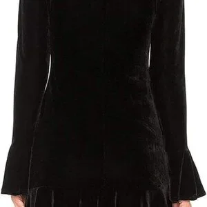 This is a sleek, fitted velvet mini dress with a high neckline, flared long sleeves, and a ruffle hem β perfect for nights out, holidays, or cooler weather styling.