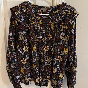 The perfect transitional button up blouse with ruffle detailing at the shoulders! Featuring long sleeves, smocking at the wrists and neckline, and a black floral print that matches the Floral Tiered Skirt for the perfect feminine style.