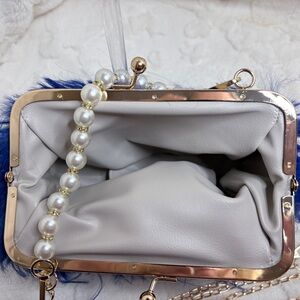 Blue Faux Fur Handbag with Pearl Strap