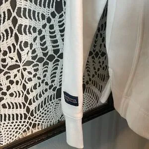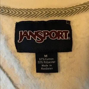 Clean white half-zip sweatshirt by Jansport. Features a small red embroidered "Cal" logo on the chest. Mock neck and long sleeves for casual wear. Simple wardrobe staple, easy to layer.