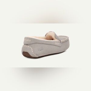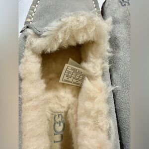 Step into cozy luxury with these authentic UGG Ansley slippers in a beautiful soft grey suede. Lined with plush genuine sheepskin, these moccasin-style slippers are perfect for lounging or casual errands. Durable rubber outsole makes them versatile for both indoor and light outdoor wear.