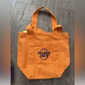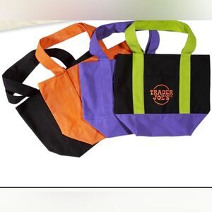 Set of vibrant tote bags from Trader Joe's in orange, black, and purple. Perfect for shopping or daily use.
