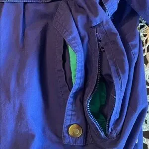 Lightweight blue shirt jacket with teal accents. Features a stand collar with drawcords, front zip and snap closure, and zippered pockets. Elastic hem and cuffs for a secure fit. Versatile layering piece for casual wear. Color: blue with teal trim.