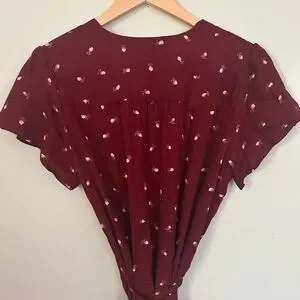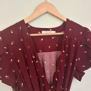 Chic burgundy midi dress with wrap design. Features delicate pattern and short sleeves. Ideal for versatile styling.