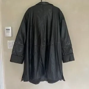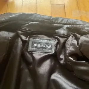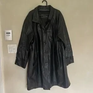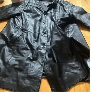Pelle & Fino black leather jacket coat. This stylish outerwear piece offers a classic button-up front with a sophisticated collar and a smooth lining for comfortable wear. Its timeless design makes it suitable for everyday outings or adding a polished touch to an evening ensemble.