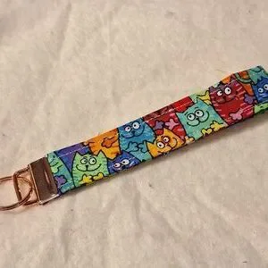 Stylish 6" wristlet key holder with a crazy cats pattern, perfect for organizing your keys. Features a bright blend of red, yellow and orangetones for a great look.