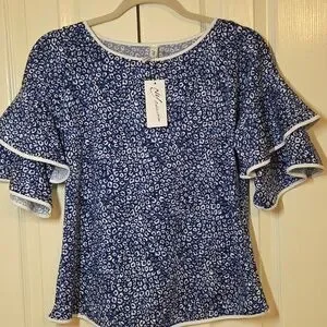 NY Collection Blue Animal Print Ruffle Sleeve Blouse