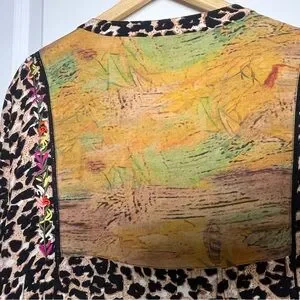 Flowy women's peasant top featuring a bold leopard print and a multicolor embroidered yoke. Lightweight fabric with a tie-front neckline for an adjustable fit. Vibrant embroidery adds boho-inspired detail to the tan and black print. Easy-to-style piece for casual or dressed-up looks.
