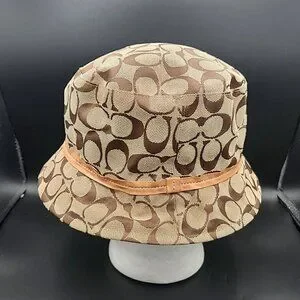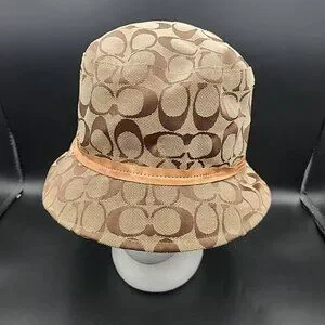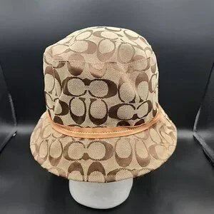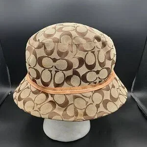 A few small marks pictured. The Vintage Y2K Coach Signature Monogram Bucket Hat in beige tan is a stylish accessory perfect for both men and women. Made by the renowned brand Coach, this bucket hat features the iconic monogram signature and is available in size M/L. The classic beige color adds a touch of sophistication to any outfit, making it a versatile and timeless piece for any wardrobe.