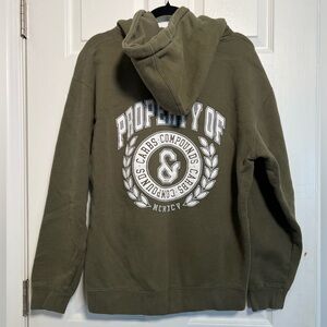 Comfortable olive green hoodie with 'Carbs & Compounds' chest graphic. Soft, midweight fabric with drawstring hood and front kangaroo pocket.