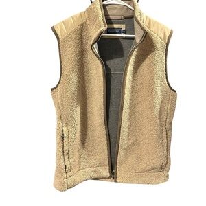 Very nice condition. Two front side zip pockets. Zips up front. Tan Sherpa with gray sweatshirt feel lining. Inner waist cinch cord for warmth. Measures approximately: shoulder to shoulder 18 inches, pit to pit 22 inches, across waist 21 inches, and back length 28 inches.