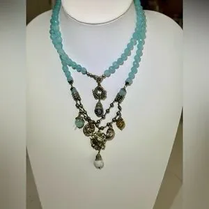 The Love Heals necklace is a unique and beautifully crafted piece of jewelry that features pendants in multiple shapes, all designed to promote healing and love. Signed by the brand, this vintage necklace is handmade and features blue and aqua colors, adding a pop of vibrancy to any outfit. The layered and faceted beaded style makes it a statement piece that can be worn daily or for special occasions