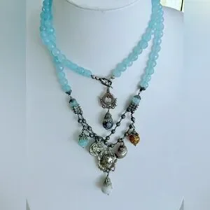 This unique necklace is a handcrafted artisan necklace, featuring aquamarine beads and sterling silver charms as well as semi precious stones. The design blends natural elements with a vintage or โboho" aesthetic, characterized by its layered structure and varied pendants, which include coins, shells, and a central white stone drop.