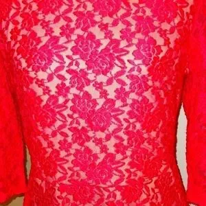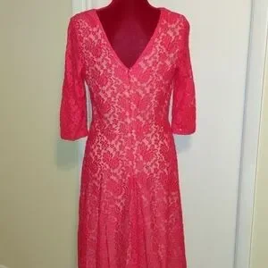 Lipstick pink lace lays beautifully over a nude lining in this A-line dress from Melrose. V neck front; 3/4 length sleeves. EUC.