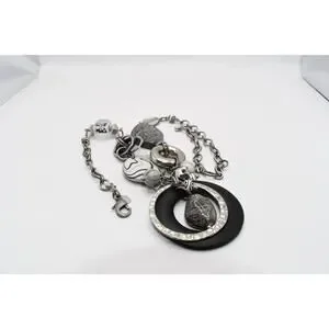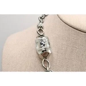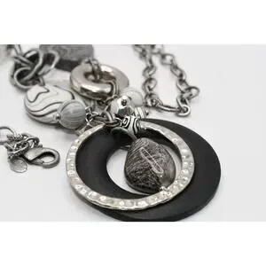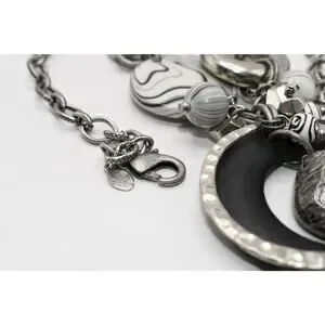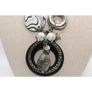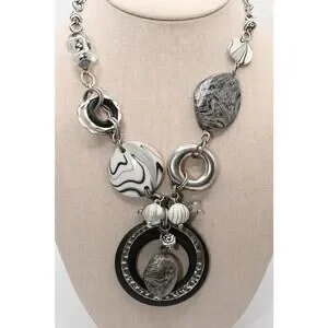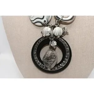 This bold Chico’s statement necklace features an eye-catching mix of black, white, and silver tone elements with a striking dark brown wooden ring centerpiece. The design combines smooth Lucite beads, marbled acrylic accents, and textured silver tone links for a modern, artistic look.