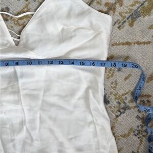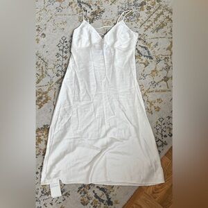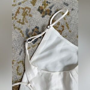 Lightweight white slip dress with delicate adjustable spaghetti straps. Smooth, soft fabric. Subtle bust seam detail for a flattering fit. Simple, timeless silhouette easy to pair with other pieces.