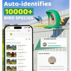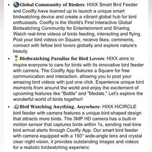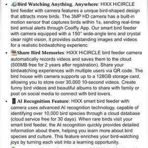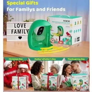 The HIXX Smart Bird Feeders with Camera are small, multicolor seed feeders made of plastic. Designed for birds, these feeders are equipped with a camera that uses Al technology to identify different species of birds. The solar-powered feature ensures that the feeder remains functional without the need for frequent battery replacements.