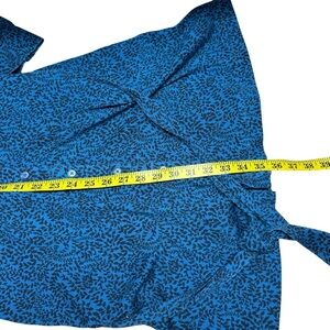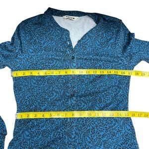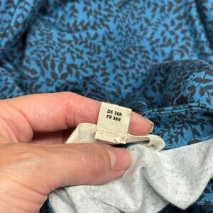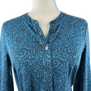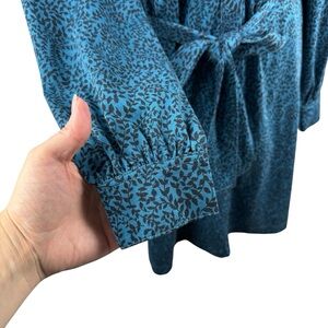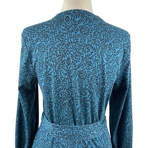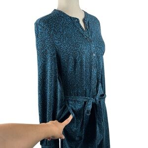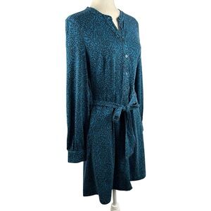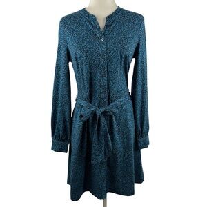 Long-sleeve button-front midi dress by Boden. Teal printed fabric with subtle black pattern. Self-tie waist for a tailored silhouette. Classic neckline and modest slit. Polished piece for work or outings.