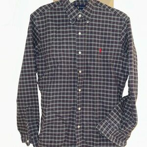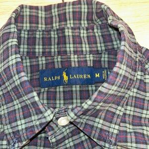 Ralph Lauren long-sleeve button-down shirt. Classic plaid pattern in green and navy. Button-down collar and white buttons. Embroidered red pony logo on chest. Versatile casual-to-smart style.