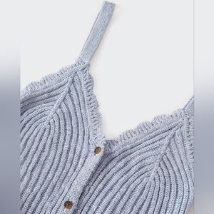 Medium knit, Cotton and linen mix, Long design, Tailored design, V-neck, Thin straps, Without inner lining, Scalloped edges, Button fastening on the front section, Fits small to size