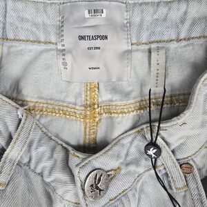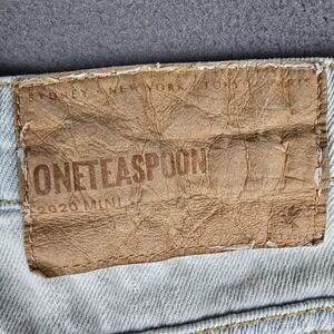 Features: Button fly closure; five-pocket jean styling; belt loops; raw cut hem; small side vents with branded rivet/tab; ONETEASPOON-branded hardware and back leather patch