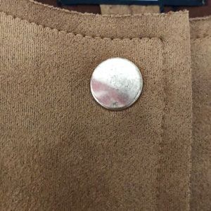 Beautiful Zara faux suede jacket with wide band of faux fur trim. Raw edges at neck and sleeves. Very nice jacket with minor flaws seen in pictures - loose thread at neckline, loose thread in front at horizontal seam and minor wear on buttons. Very cute, trendy jacket! Size small.
