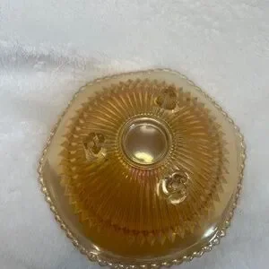 Design: Marigold (iridescent gold/orange) glass with a scalloped, beaded rim and a textured bottom pattern.