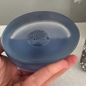 Frosted blue glass bottle with silver-tone cap and accents. Minimal gold-tone logo on front. Clean, modern fragrance presentation. Ideal for display or gifting.
