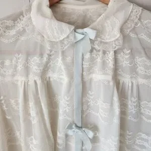 Elegant vintage Odette Barsa lace peignoir robe from the 1950s–1960s. Features sheer ivory nylon with intricate floral lace, pale blue satin ribbon ties, and a romantic Peter Pan collar. A stunning example of mid-century luxury lingerie, perfect for collectors, bridal trousseau, or vintage boudoir styling.