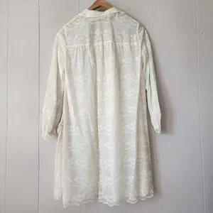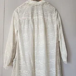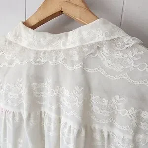 Features: Peter Pan collar, long sleeves with lace cuffs, three satin ribbon ties, flowing silhouette