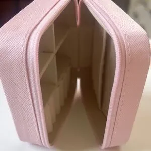 Compact travel jewelry case in soft pink. Structured exterior with zip closure. Interior slots for rings and small pieces.