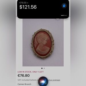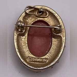Features a coral and cream cameo set in gold-tone metal.