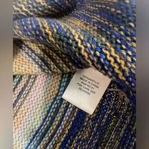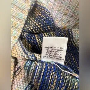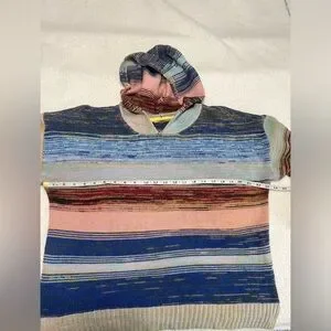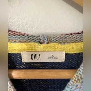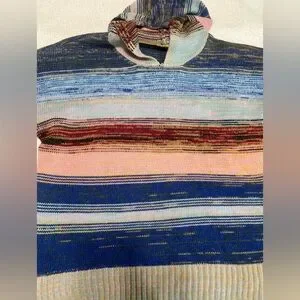 Beautiful OVLA hooded knit sweater in excellent used condition. Features a soft, textured acrylic knit with multicolor horizontal striping in blues, pinks, neutrals, and earthy tones. Relaxed boho silhouette with a cozy hood and ribbed hem and cuffs.