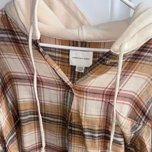 Casual hooded button-up from American Eagle. Tan, rust and navy plaid pattern. Cream attached hood with drawstrings. Soft flannel-like fabric for layering.
