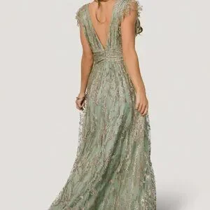 The Arlene Shimmer Gown in Sage & Gold pairs ethereal tulle with sparkling sequin embroidery for an elegant maxi silhouette. Designed as a Baltic Born exclusive, this gown features a deep V at the front and back, a high banded waist, delicate tulle frill sleeves and a left-side leg slit — all finished with a fully lined, comfortable interior. Ideal for weddings, formal events, and special occasions where refined shine and movement matter.