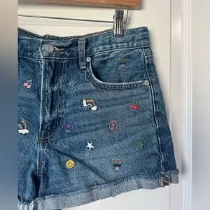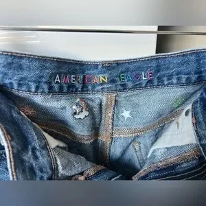 American Eagle (AE) Denim '90s Boyfriend Shorts in a medium wash featuring multicolored embroidered symbols.