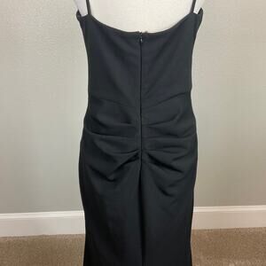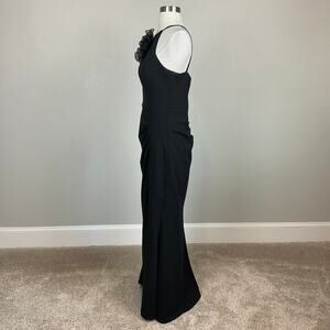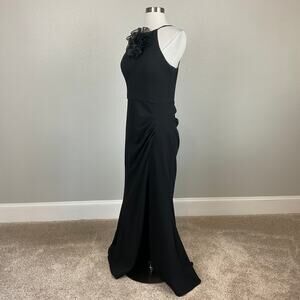 Keywords: XSCAPE, Black, Halter, Rosette Detail, Thigh Slit, Scuba Crepe, Knit Crepe, Form Fitting, Sleeveless, Floor Length, Maxi, Gown, Wedding Guest, Evening, Red Carpet, Black Tie, Gala, Prom, Pageant, Mother of the Bride, Mother of the Groom, Size 14, NWT