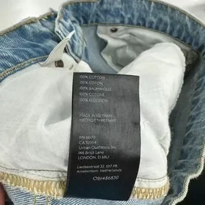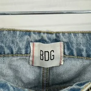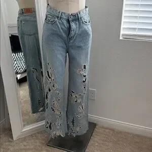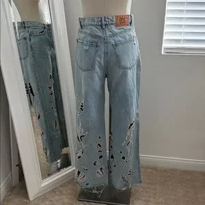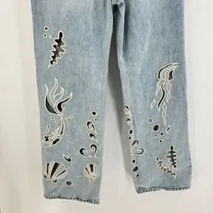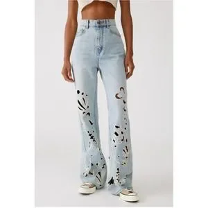 Stylish flare jeans by BDG. Light blue denim with unique artistic patterns. Perfect for a trendy look.