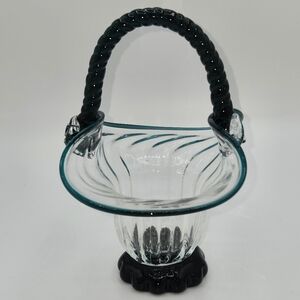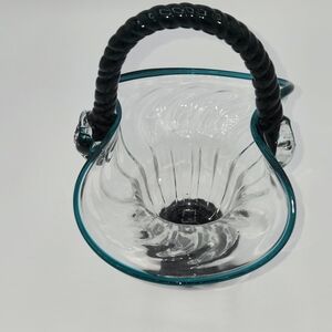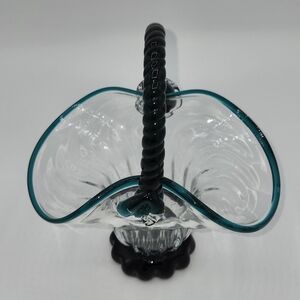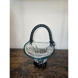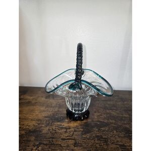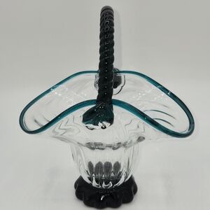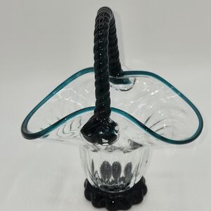 Vintage Clear & Turquoise Hand Blown Optic Glass Basket Applied Rope Handle