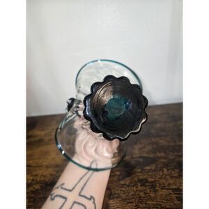 This vintage hand blown glass basket is a unique addition to any Mid-Century Modern collection. The clear and turquoise colors create a beautiful contrast, and the applied rope handle adds a touch of rustic charm. Measuring 6 1/4 inches in length, 4 1/4 inches in width, and 8 inches in height, this basket is perfect for decorative purposes or storing small items.