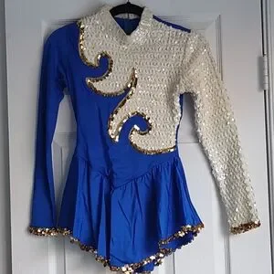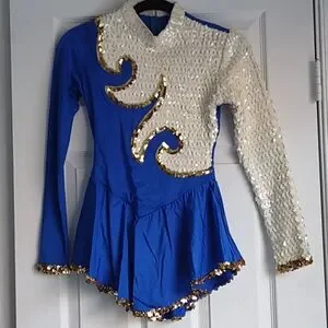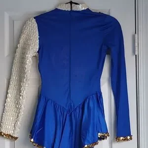 THERE IS A SLIGHT DISCOLORATION ON THE BACK OF THE DRESS PLEASE SEE PHOTO.........the Blue and White small Sequenc ladies Sparkling blue and white figure skating dress with gold sequin accents. Stretchy blue skirt and body allow freedom of movement. White sequin-covered bodice and sleeve add bold shine. Gold trim highlights the design for stage-ready sparkle. good for testing or competitions