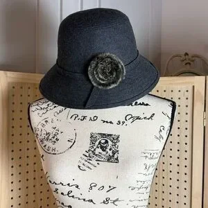 Magid Hats Wool Cloche Hat Gray Faux Fur Flower Vintage Style Winter