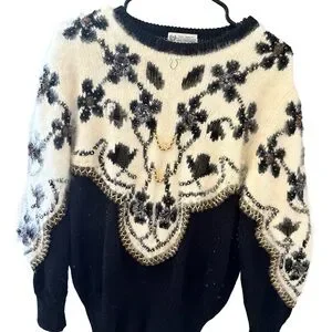 Stylish black and cream knit sweater with floral embroidery and sequin embellishments. Soft, cozy fabric with decorative gold-tone accents for a luxe touch. Easy to pair and perfect for elevated casual looks.
