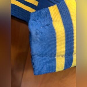 Snap-front closure, striped rib-knit collar, cuffs, and hem, and two front slash pockets.