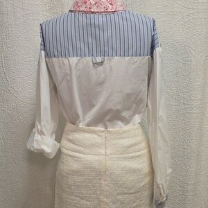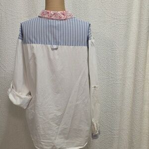 Unique Teddi patchwork button-up shirt with floral and striped patterns. Features blue, white, and pink colors. It is missing the very bottom button. Women's size large. 80% cotton, 20% polyester. Feel free to ask any questions!