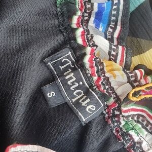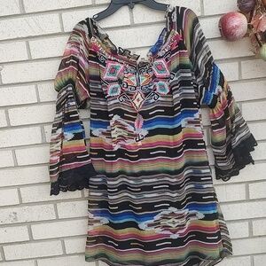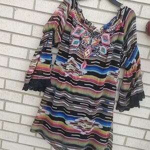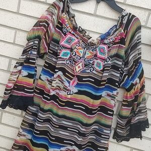 Stylish boho off-shoulder top with vibrant multicolor stripes and intricate embroidery. Lightweight, flowing fabric for comfortable all-day wear. Features elasticized neckline and feminine ruffled sleeves. Multicolor design adds a bold, playful touch to casual outfits.