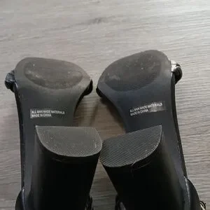 Stylish black block heel sandals featuring a braided front strap and ankle buckle for a secure fit. Soft tan insole and cushioned footbed for all-day comfort. Versatile black design that pairs easily with dresses or jeans.
