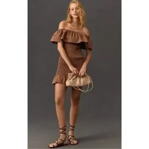NWT Anthropologie Off-The-Shoulder Smocked Mini Dress Brown Size XS