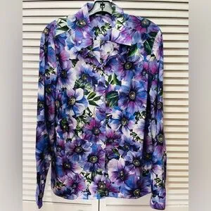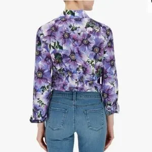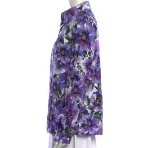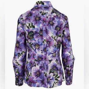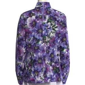 Dolce & Gabanna purple Anemone floral button down long sleeve blouse. Pointed spread collar, single button squared cuffs, front button placket. 100% cotton, Made in Italy.