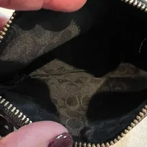 Compact Coach wristlet in smooth black leather. Contrast white topstitching accents the edges. Secure zip closure and detachable wrist strap. Embossed Coach logo on front. Sleek, versatile accessory for essentials.